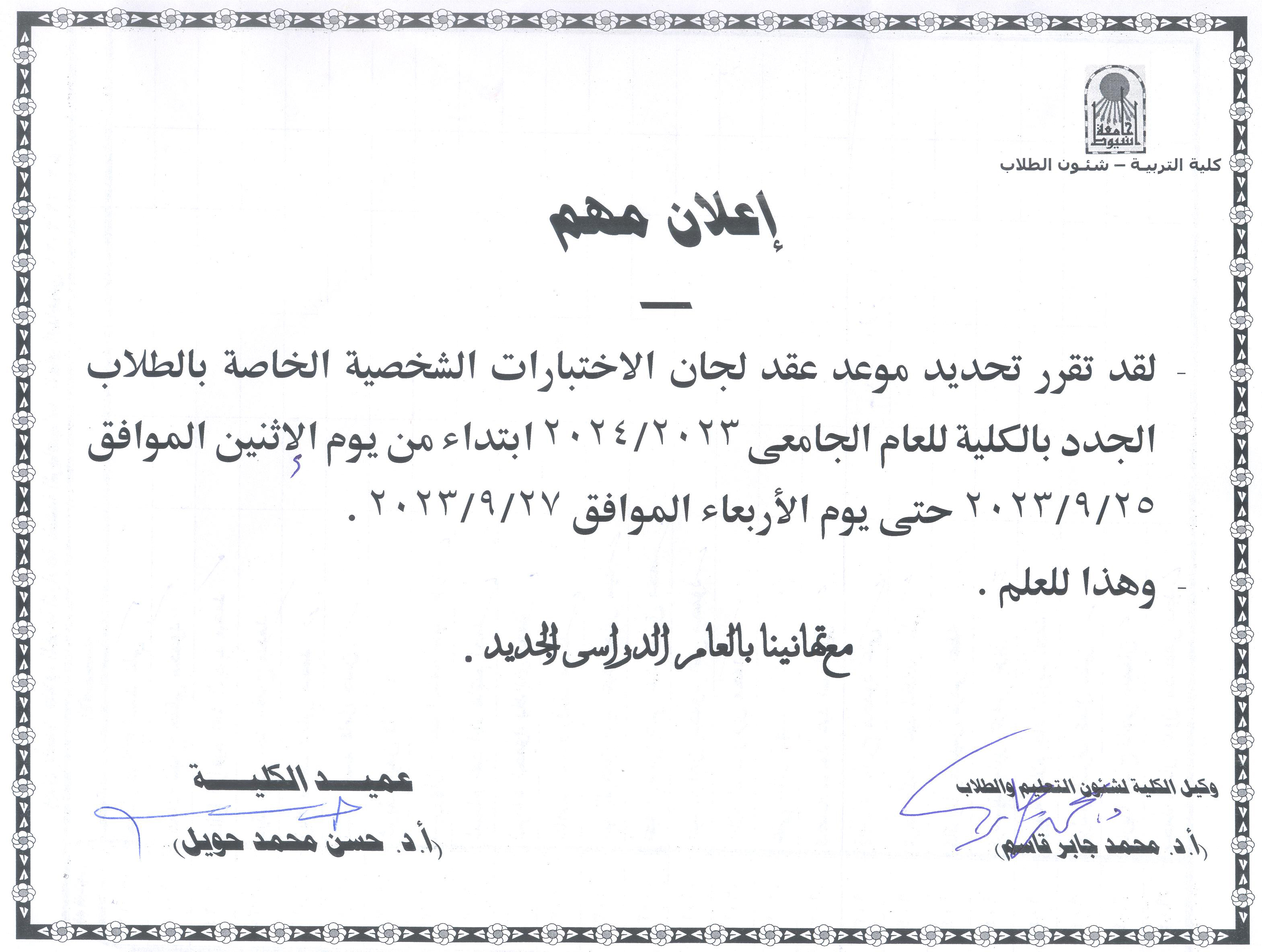 اختبار المقابلات الشخصية للطلاب الجدد المرشحين للقبول بالدبلوم العامة والمهنية العام الجامعى 2023-2024