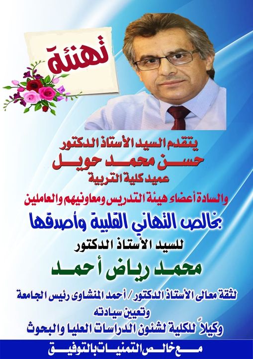 يتقدم السيد الأستاذ الدكتور/ حسن محمد حويل عميد الكلية بأجمل التهاني للدكتور / محمد ممدوح حسين عبد الحافظ المدرس المساعد بقسم المناهج وطرق التدريس بالكلية لحصوله على درجة الدكتوراة في التربية مع تمنياته له بدوام النجاح والتقدم