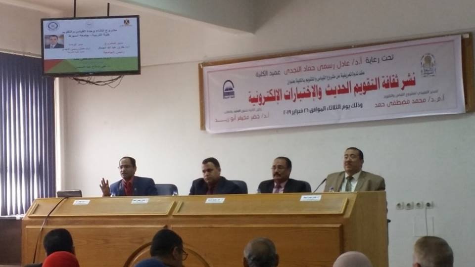 شهدت كلية التربية بجامعة أسيوط ندوة تعريفية عن مشروع مركز القياس والتقويم بالكلية بعنوان " نشر ثقافة التقويم الحديث والاختبارات الإلكترونية"، وذلك تحت رعاية الاستاذ الدكتور طارق الجمال رئيس الجامعة وبحضور الاستاذ الدكتور عادل رسمي النجدي عميد الكلية و الاستاذ الدكتور خضر مخيمر أبو زيد وكيل الكلية لشئون التعليم والطلاب و الاستاذ الدكتور حمدي البيطار مدير وحدة ضمان الجودة بالكلية والمدير التنفيذي لمشروع القياس والتقويم ونائبه الدكتور محمد مصطفى حمد أستاذ أصول التربية المساعد والدكتور علي صلاح عبد المحسن المدرس بقسم علم النفس بالكلية.