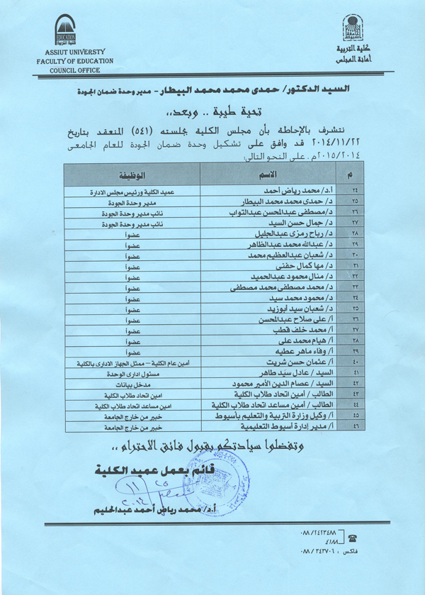 The Council of the College of Education No. 541 held on 11.22.2014 m To form a unity quality, Faculty of Education for the academic year 2014 to ensure - 2015 - M As follows
