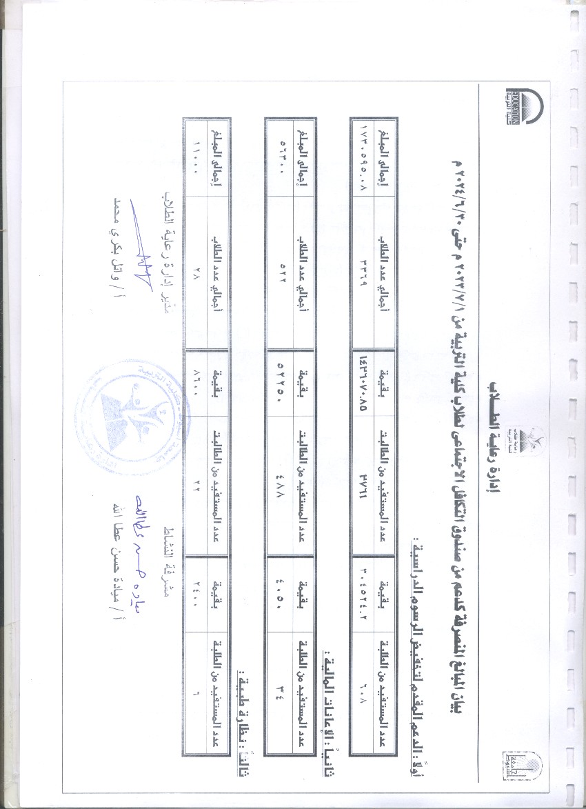 - يجب أن يتم الدفع بعد تقديم جميع المستندات المطلوبة إلى إدارة رعاية الشباب بالكلية.