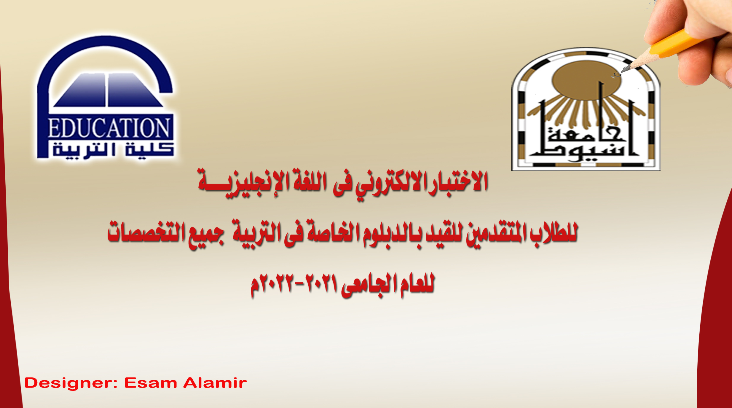 اختبارت القبول للطلاب المتقدمين للقيد بالدبلوم الخاصة اختبار اللغة الانجليزية العام الجامعي 2021-2022م 23 سبتمبر 2021 تعقد اختبارت القبول للطلاب المتقدمين للقيد بالدبلوم الخاصة العام الجامعي 2021-2022م اختبار اللغة الانجليزية يوم الاحد الموافق 10 اكتوبر 2021م بدء من الساعة العاشرة صباحاً حتى الثانية ظهراً على الرابط التالي اضغط هنا