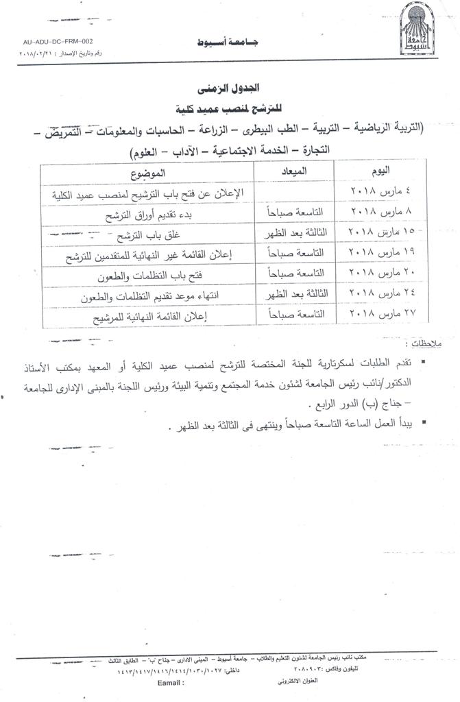 الجدول الزمنى الخاص بالتقدم لشغل وظيفة عميد الكلية وشروط الترشح والارواق المطلوبة 27 فبراير 2018 الجدول الزمنى الخاص بالتقدم لشغل وظيفة عميد الكلية وشروط الترشح والارواق المطلوبة