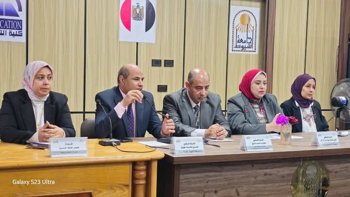 The seminar was held under the supervision of Dr. Hassan Hawil, Dean of the Faculty of Education; Dr. Amani Mohamed Sharif, Vice Dean for Community Service and Environmental Development; Ms. Abeer Gomaa Hussein, Director of the Assiut Media Department; and Ms. Fatima Ahmed, Deputy Director of the Assiut Media Department. Attendees included faculty members, teaching assistants from various university faculties, staff members, and a large number of students.