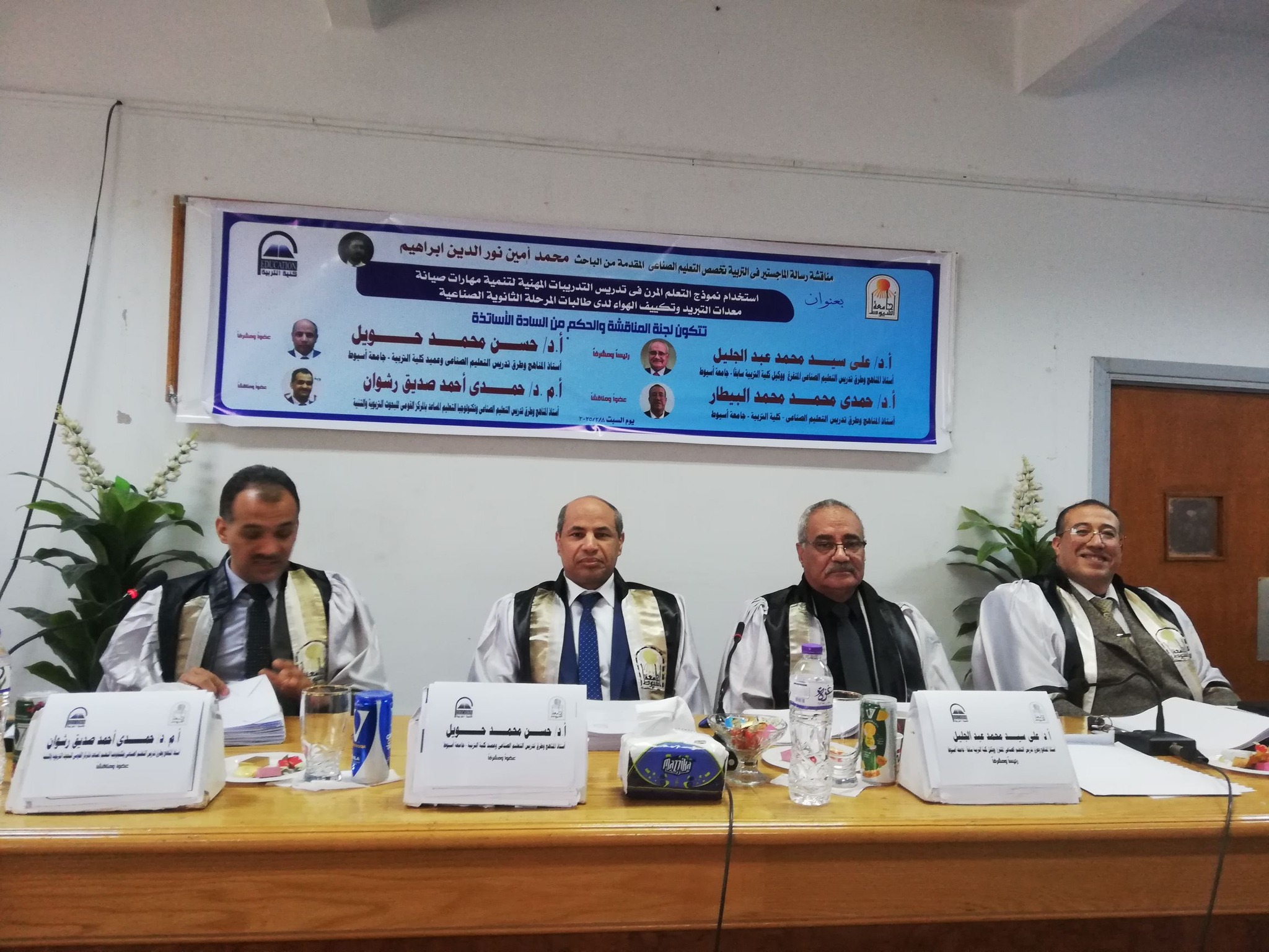 The discussion and judging committee consisted of Prof. Dr. Ali Sayed Abdel Jalil, Professor of Curricula and Teaching Methods of Industrial Education, full-time, as Chairman and Supervisor.