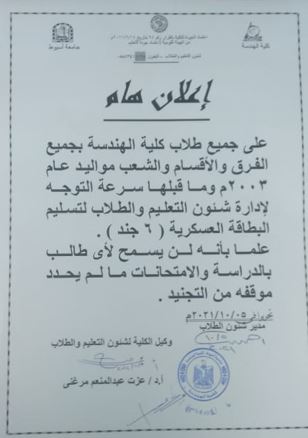 علما بأنه لن يسمح لأى طالب بالدراسة والإمتحانات ما لم يحدد موقفة من التجنيد
