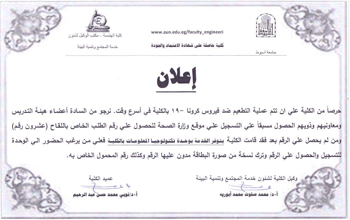 إعلان هام عن التطعيم ضد فيروس كرونا للسادة أعضاء هيئة التدريس بكلية الهندسة