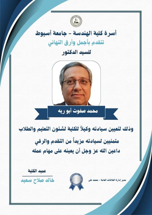 بالانابة عن ادارة الكلية وجميع منتسبيها، يتقدم الأستاذ الدكتور خالد صلاح عميد الكلية بخالص التهاني للاستاذ الدكتور محمد صفوت أبوريه بمناسبة صدور قرار معالي الاستاذ الدكتور أحمد المنشاوي رئيس الجامعة بتعيين سيادته وكيلا للكلية لشئون التعليم والطلاب. مع خالص الامنيات لسيادته بالتوفيق والسداد.