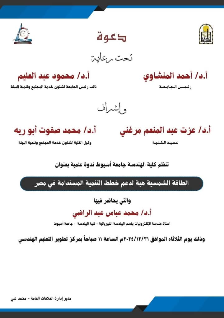 دعوة لحضور ندوة علمية بعنوان " الطاقة الشمسية هبة لدعم خطط التنمية المستدامة "