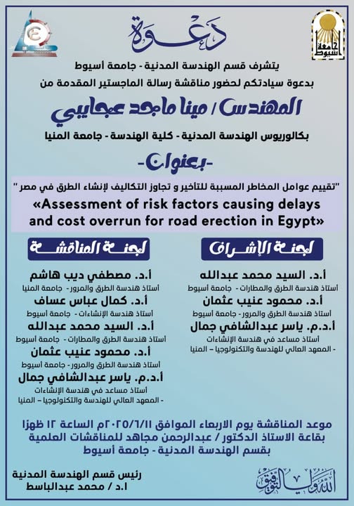 يتشرف قسم الهندسة المدنية بدعوة سيادتكم لحضور مناقشة رسالة الماجيستير المقدمة من المهندس/ مينا ماجد عجايبى، بكالوريوس الهندسة المدنية بقسم الهندسة المدنية جامعة المنيا بعنوان " تقييم عوامل المخاطر المسببة للتأخير وتجاوز التكاليف لإنشاء الطرق فى مصر" وذلك يوم *الأربعاء * الموافق 11-6-2025.. الساعة الثانية عشر ظهراً بقاعة الأستاذ الدكتور/ عبد الرحمن مجاهد للمناقشات العلمية بقسم الهندسة المدنية.