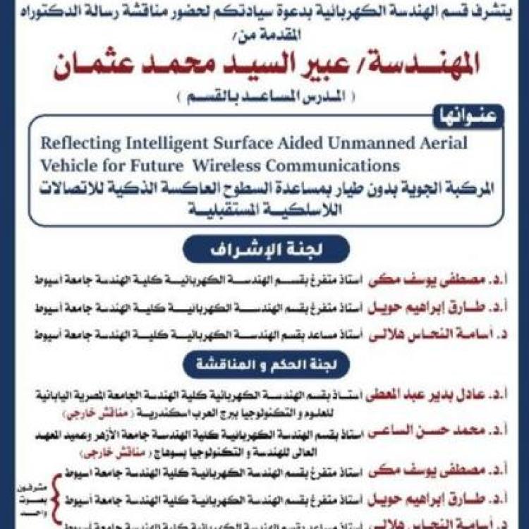 مناقشة رسالة الدكتوراه المقدمة من المهندسة/ عبير السيد محمد عثمان المدرس المساعد بقسم الهندسة الكهربائية