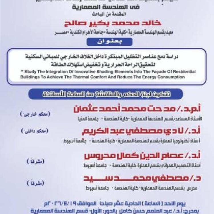 مناقشة رسالة الماجستير المقدمة من المهندس/ خالد محمد بكير صالح المعيد بقسم الهندسة المعمارية بكلية الهندسة جامعة الأهرام الكندية بمصر