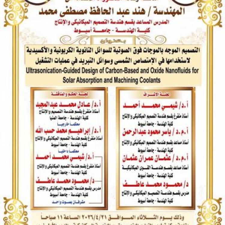 مناقشة رسالة الدكتوراه المقدمة من المهندسة/ هند عبد الحافظ مصطفى محمد المدرس المساعد بقسم هندسة التصميم الميكانيكى والإنتاج