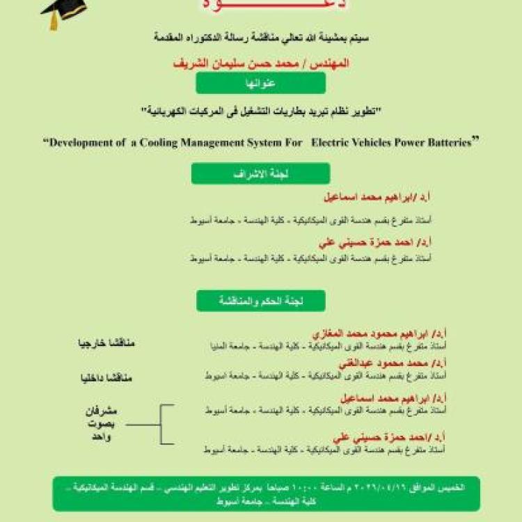 مناقشة رسالة الدكتوراه المقدمة من المهندس/ محمد حسن سليمان الشريف بقسم هندسة القوى الميكانيكية