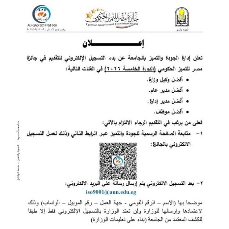 إعلان إدارة الجودة والتميز بالجامعةعن التقديم فى جائزة مصر للتميز الحكومى الدورة الخامسة 2026
