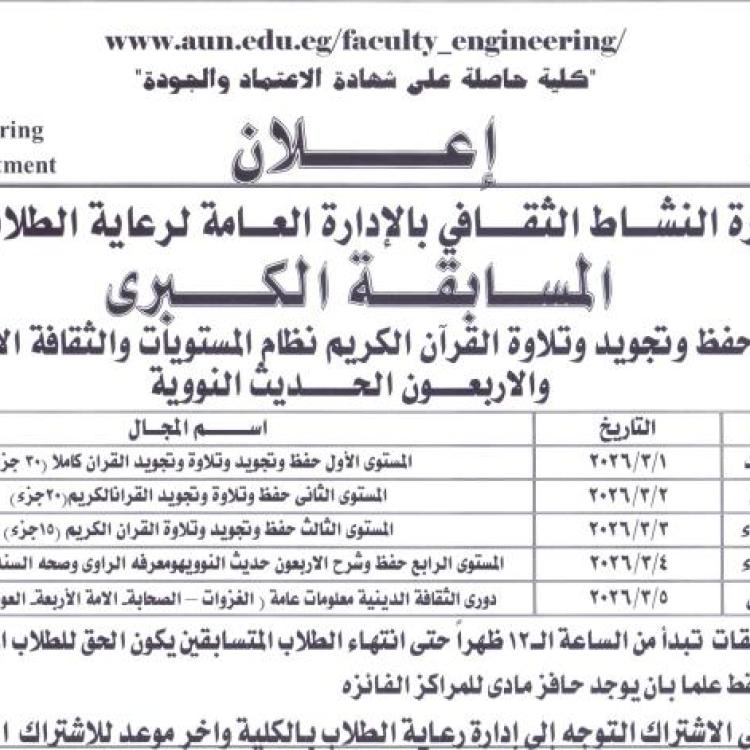 اعلان اللجنة الثقافية عن المسابقة الكبرى فى حفظ القران الكريم