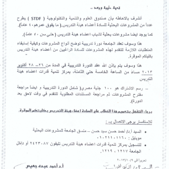 بناء على البيان الصادر من مجلس ادارة صندوق العلوم والتنمية التكنولوجية فى اجتماعاته رقم 46 بتاريخ 25/8/2013 لوضع الرابط الخاص…