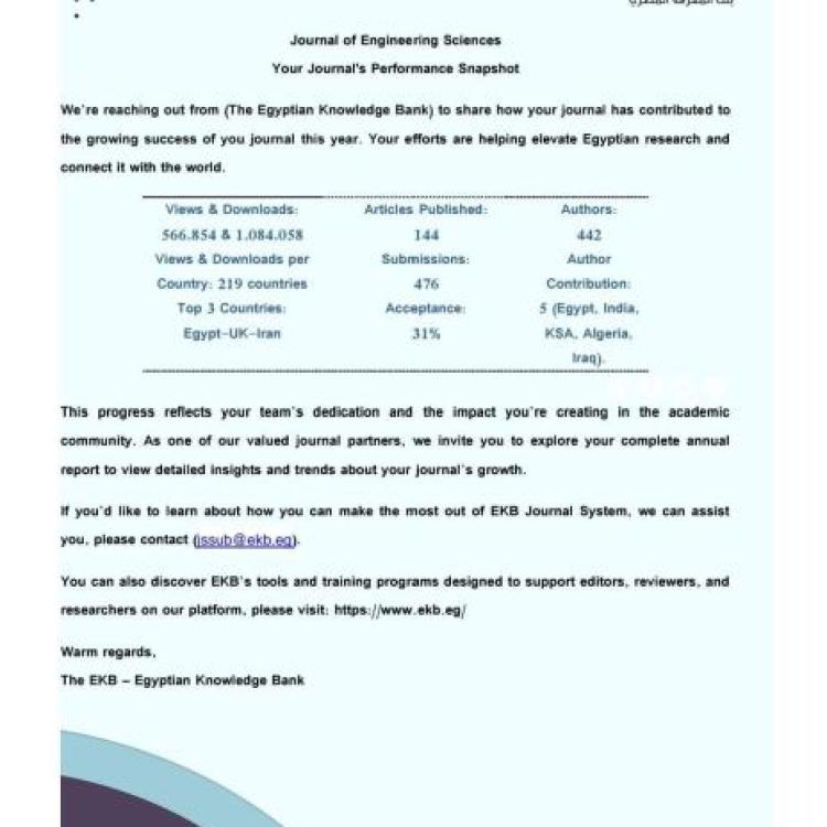 بنك المعرفة المصري يصدر تقريرًا حديثًا يرصد أداء مجلة العلوم الهندسية (Journal of Engineering Sciences) التي تصدرها الكلية خلال العام الماضي.
