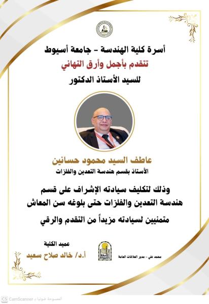 تهنئة السيد الأستاذ الدكتور/ عاطف السيد محمود حسانين