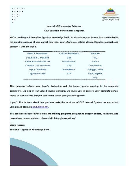 أصدر بنك المعرفة المصري تقريرًا حديثًا يرصد أداء مجلة العلوم الهندسية (Journal of Engineering Sciences) خلال العام الماضي