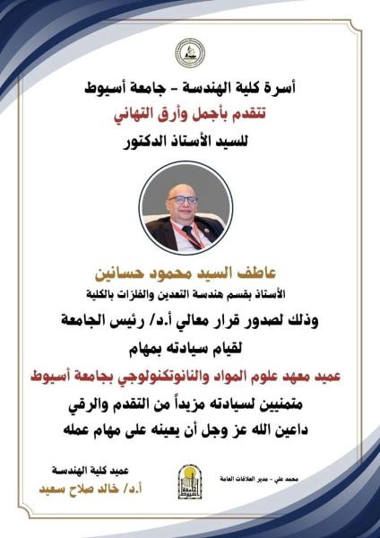 بالانابة عن ادارة الكلية وجميع منتسبيها، يتقدم الاستاذ الدكتور/ خالد صلاح عميد الكلية بأخلص التهاني والتبريكات للأستاذ الدكتور/ عاطف السيد محمود النقيب الاستاذ بقسم هندسة التعدين والفلزات بالكلية بمناسبة صدور قرار معالي الاستاذ الدكتور/ أحمد المنشاوي رئيس الجامعة بتكليف سيادته قائما بعمل عميد معهد علوم المواد والنانو تكنولوجي بالجامعة.. متمنين لسيادته كل التوفيق والسداد في مهامه الجديدة.