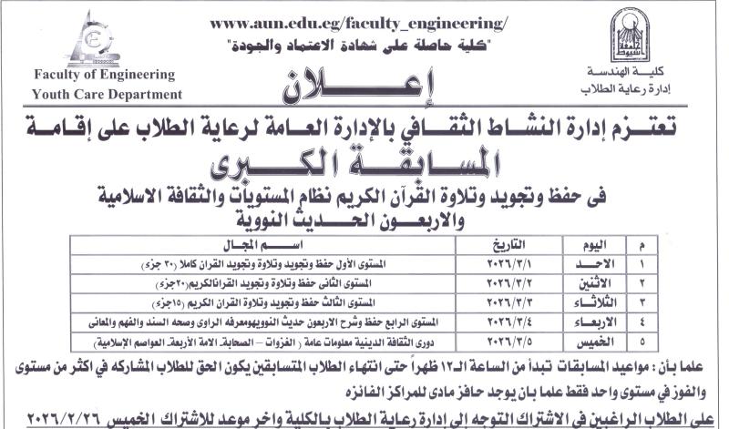 اعلان اللجنة الثقافية عن المسابقة الكبرى فى حفظ القران الكريم