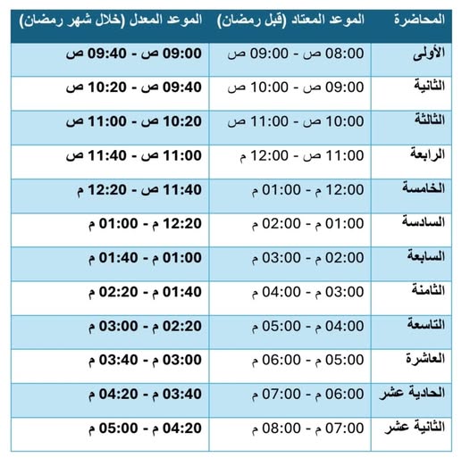 مواعيد الجداول الدراسية بشهر رمضان المعظم