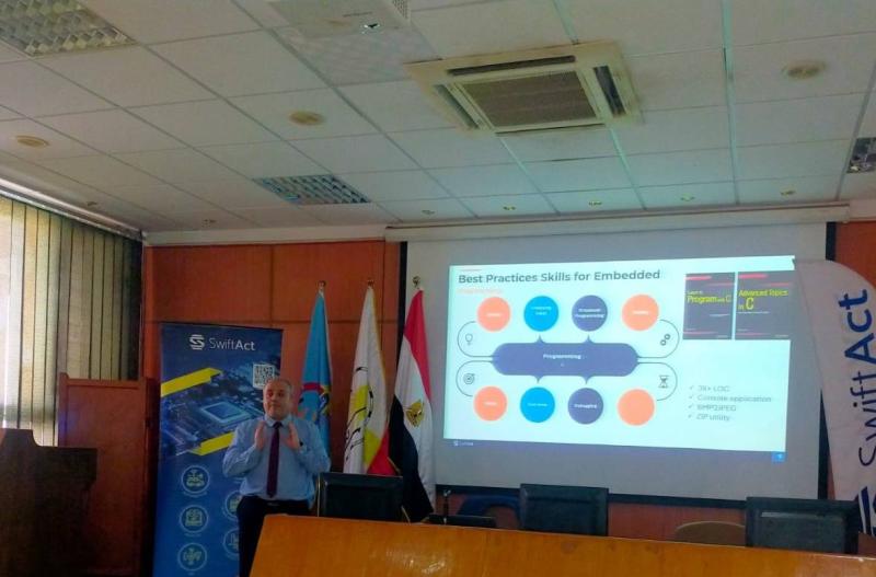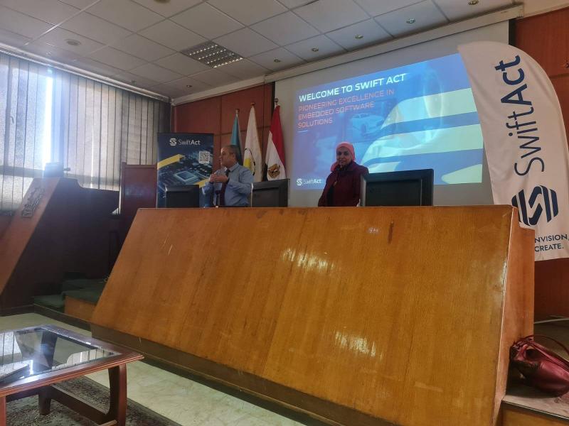 تحت رعاية الاستاذ الدكتور أحمد المنشاوي رئيس الجامعة والاستاذ الدكتور أحمد عبد المولى نائب رئيس الجامعة لشئون التعليم والطلاب والاستاذ الدكتور خالد صلاح عميد الكلية، وبإشراف الأستاذ الدكتور محمد صفوت أبوريه وكيل الكلية لشئون التعليم والطلاب، والدكتورة زينب ابراهيم عبد الشافي مدير وحدة متابعة الخريجين والتوظيف، وفي اطار مساعي الكلية للتواصل مع الجهات الصناعية وجهات التوظيف المختلفة، لتعريف الطلاب بالمهارات المطلوبة لسوق العمل، بجانب توفير فرص وظيفية لخريجي الكلية، استضافت الكلية يوم الاربعاء الموافق ١١ فبراير ٢٠٢٦ شركة سويفت اكت، وهي من أكبر الشركات العاملة في مجال برمجة النظم المدمجة، والتي قدمت يوما توظيفيا لخريجي الكلية، حيث تم عرض مجالات العمل بالشركة والمهارات المطلوبة لسوق العمل في مجال الأنظمة المدمجة، بجانب الفرص التوظيفية المتاحة بالشركة وغيرها من الفرص التدريبية بالشركة.