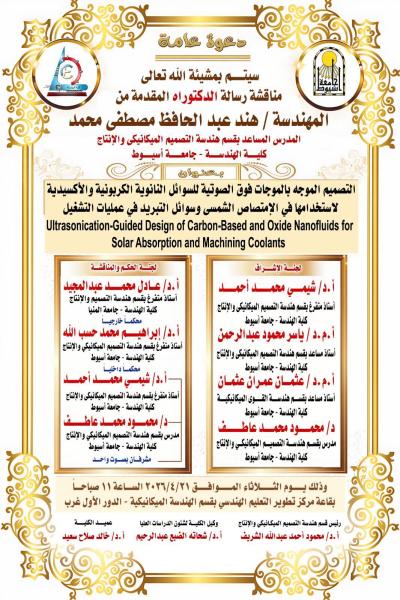 مناقشة رسالة الدكتوراه المقدمة من المهندسة/ هند عبد الحافظ مصطفى محمد المدرس المساعد بقسم هندسة التصميم الميكانيكى والإنتاج 19 أبريل 2026