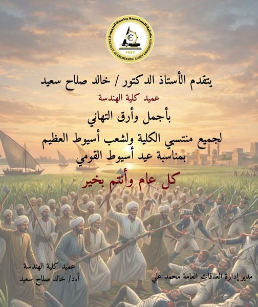 بالإنابة عن إدارة الكلية وجميع منتسبيها، يتقدم الأستاذ الدكتور خالد صلاح عميد الكلية بخالص التهاني لشعب اسيوط بمناسبة العيد القومي لأسيوط الذي يواكب ذكري انتصار بني عدي علي الحملة الفرنسية في ١٨ أبريل عام ١٧٩٩