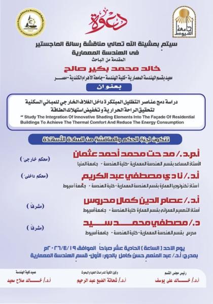 مناقشة رسالة الماجستير المقدمة من المهندس/ خالد محمد بكير صالح المعيد بقسم الهندسة المعمارية بكلية الهندسة جامعة الأهرام الكندية بمصر 16 أبريل 2026 دعوة لحضور مناقشة رسالة ماجستيرالمهندس خالد محمد بكير صالحمعيد بقسم الهندسة المعمارية بكلية الهندسة جامعة الأهرام الكندية بمصر يوم الاحد الموافق ١٩ -٤- ٢٠٢٦ الساعة ١١ صباحاًبمدرج ا.د. عبدالمنعم حسن كامل