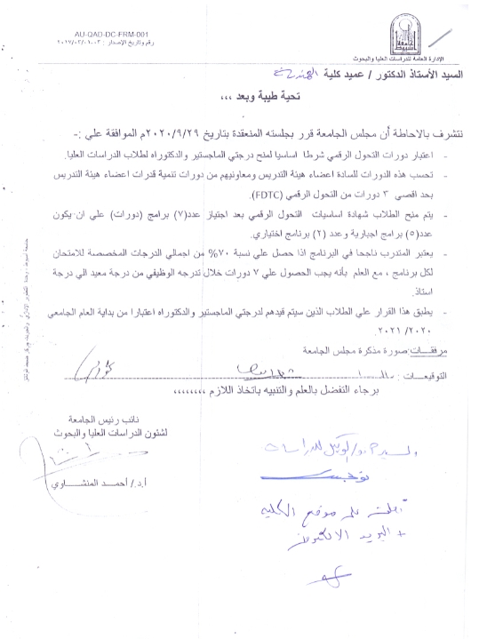 دورات التحول الرقمى شرطا أساسياً لمنح درجتى الماجستير والدكتوراة Read more about دورات التحول الرقمى شرطا أساسياً لمنح درجتى الماجستير والدكتوراة دورات التحول الرقمى شرطا أساسياً لمنح درجتى الماجستير والدكتوراة 10 نوفمبر 2020