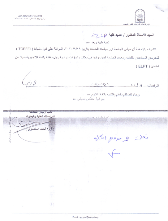 قبول شهادة (TOEFEL) للمدرسين المساعدين بكليات ومعاهد الجامعة Read more about قبول شهادة (TOEFEL) للمدرسين المساعدين بكليات ومعاهد الجامعة قبول شهادة (TOEFEL) للمدرسين المساعدين بكليات ومعاهد الجامعة 10 نوفمبر 2020
