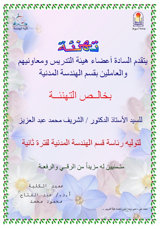 تهنئة مقدمة من قسم الهندسة المدنية للسيـد الأستاذ الدكتــور/ الشريف محمد عبدالعزيز لتوليه رئاسة قسم الهندسة المدنية لفترة ثانية 18 أبريل 2013 تهنئة مقدمة من قسم الهندسة المدنية للسيـد الأستاذ الدكتــور/ الشريف محمد عبدالعزيز لتوليه رئاسة قسم الهندسة المدنية لفترة ثانية