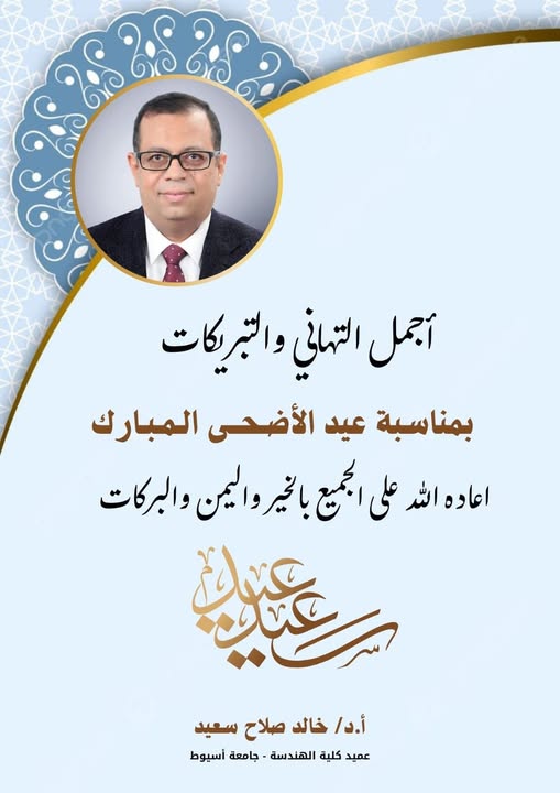 مع نسائم عيد الاضحي المبارك، وبالانابة عن ادارة الكلية، يتقدم الاستاذ الدكتور/ خالد صلاح عميد الكلية بخالص التهاني والتبريكات لجميع منتسبي الكلية من السادة اعضاء هيئة التدريس والهيئة المعاونة والجهاز الإداري والطلاب بمناسبة حلول عيد الاضحي المبارك .. اعاده الله علي الجميع بكل الخير والبركات أعوام عديدة وأزمنة مديدة.