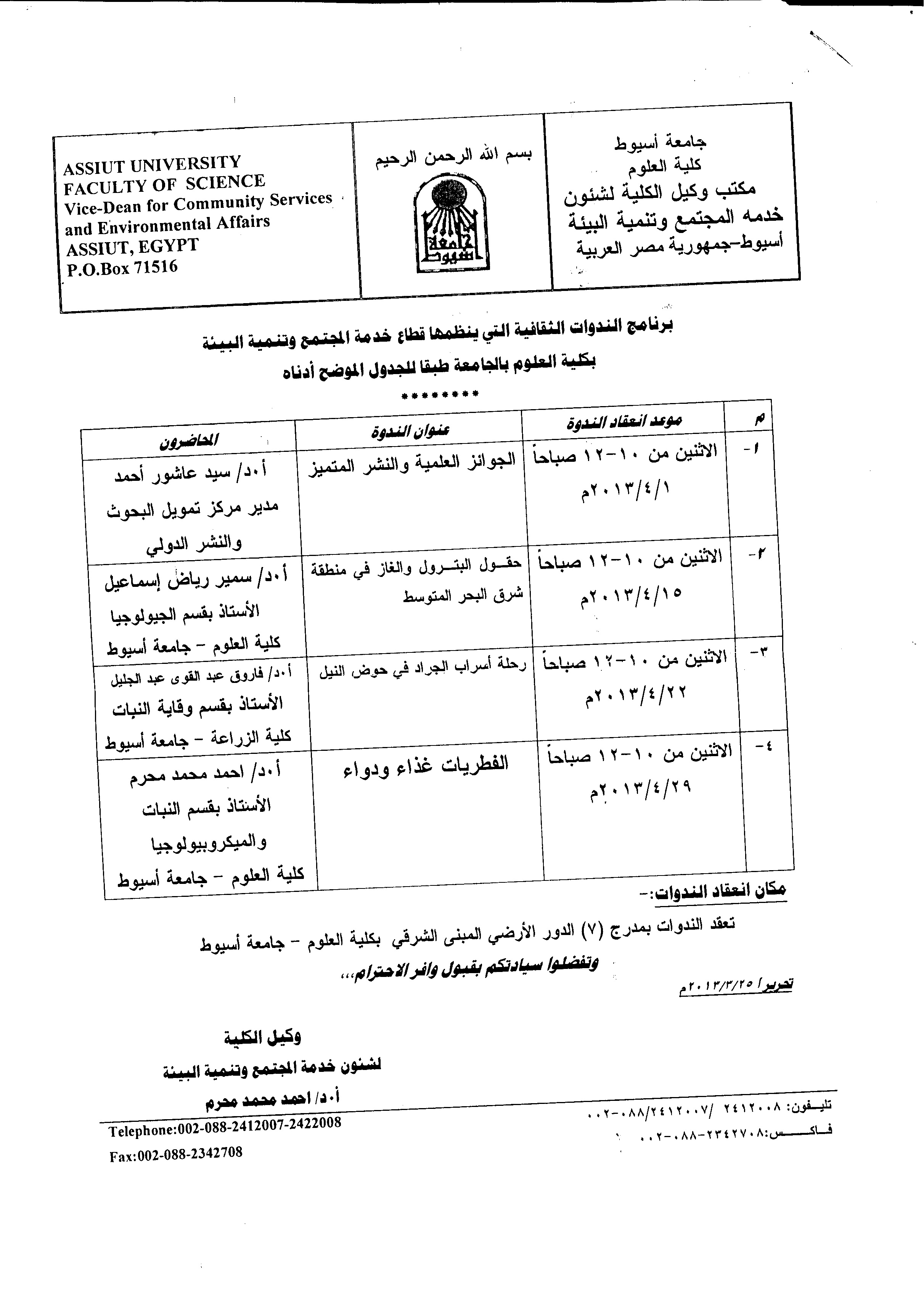The Community service and environmental development affairs in the faculty of science is holding a symposium for the faculty staff to attend its cultural programs.  For more information click here.
