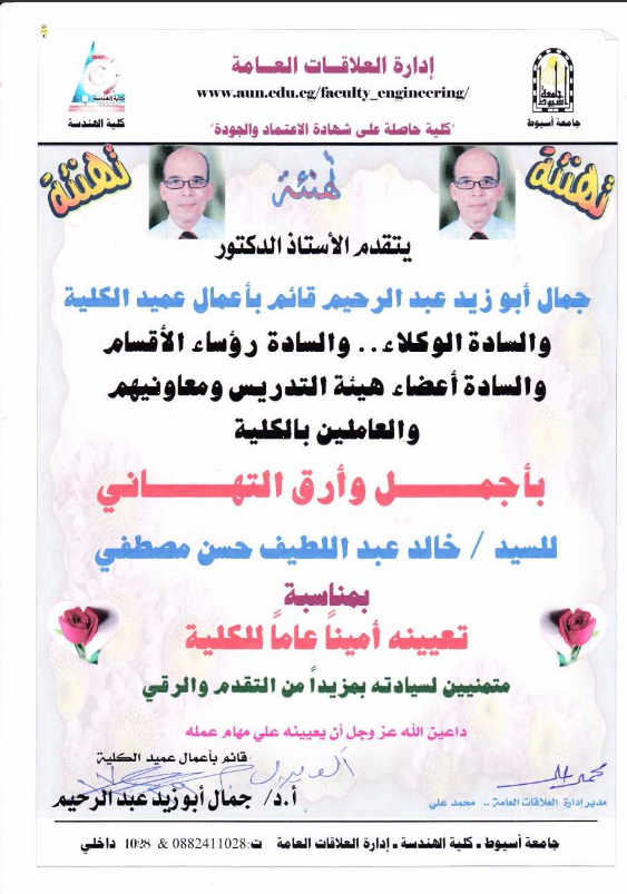 Congratulation to Mr. Khaled Abdul Latif Hassan for the appointment of his Excellency General Secretary of the Faculty of Engineering