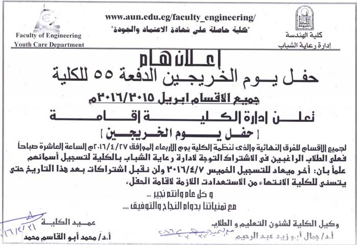The Youth Affairs of faculty of engineering decided that the 55th graduation ceremony for all the deparments will be held on Tuesday 27/4/2016 at 10:00 a.m. The deadline for booking will be 7/4/2016.