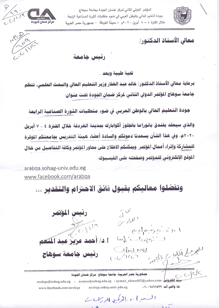 Under the auspices of His Excellency Prof. Dr. Khalid Abdul Ghaffar, Minister of Higher Education and Scientific Research, The University of Sohag organizes the second international conference of the Quality Assurance Center under the titleThe quality of higher education in the Arab world in light of the requirements of the fourth industrial revolution