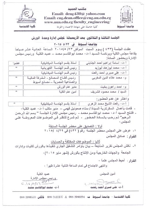 أهم قرارات اجتماع مجلس ورش كلية الهندسة 26 مايو 2015 عقدت الجلسة 433 يوم السبت الموافق 23/5/2015 الساعة الحادية عشر صباحا بقاعة مجلس الكلية برئاسة السيد الأستاذ الدكتور/ محمد أبو القاسم محمد