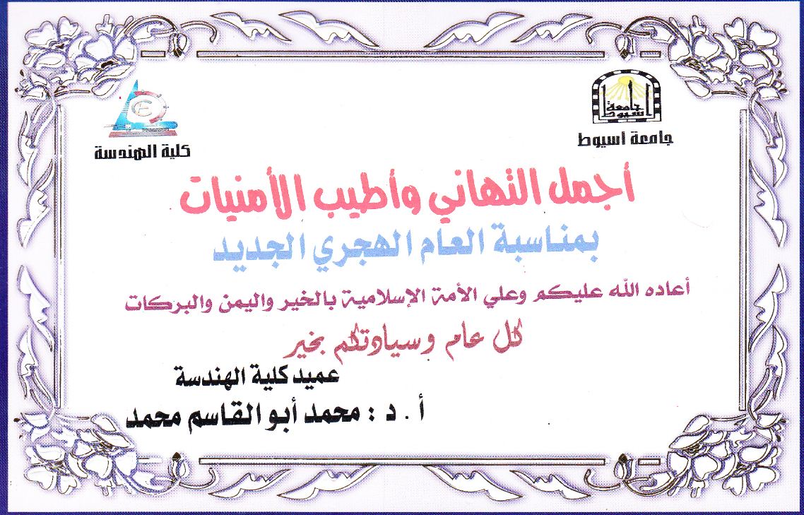اجمل التهانى واطيب الأمنيات بالعام الهجرى الجديد 22 أكتوبر 2014 يتقدم الأستاذ الدكتور/ محمد أبو القاسم محمد- عميد كلية الهندسة بأجمل التهانى وأطيب الأمنيات بمناسبة العام الهجرى الجديد اعاده الله عليكم وعلى الأمة الإسلامية الخير واليمن والبركات كل عام وسيادتكم بخير