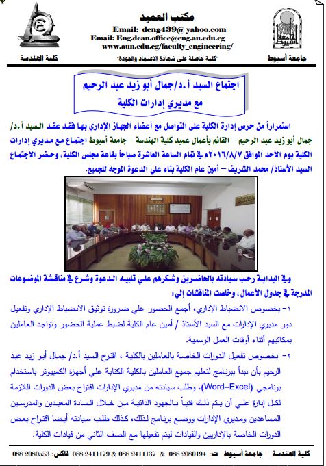 عقد السيد أ .د/جمال أبو زيد عبد الرحيم – القائم بأعمال عميد كلية الهندسة – جامعة أسيوط ، اجتماع مع مديري إدارات الكليةيوم الأحد الموافق 7/8/2016 في تمام الساعة العاشرة صباحاً بقاعة مجلس الكلية، وحضر الاجتماع السيد الأستاذ/ محمد الشريف – أمين عام الكلية بناء على الدعوة الموجه للجميع