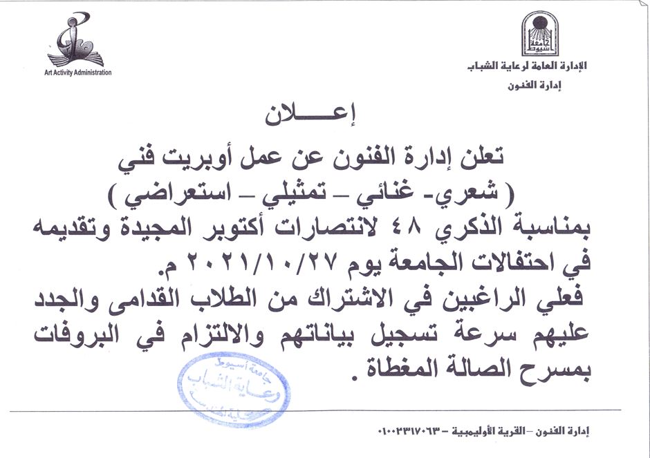 اعلان إدارة الفنون بالقرية الأوليمبية عن عمل أوبريت فنى (شعرى - غنائى - تمثيلى - استعراضى)