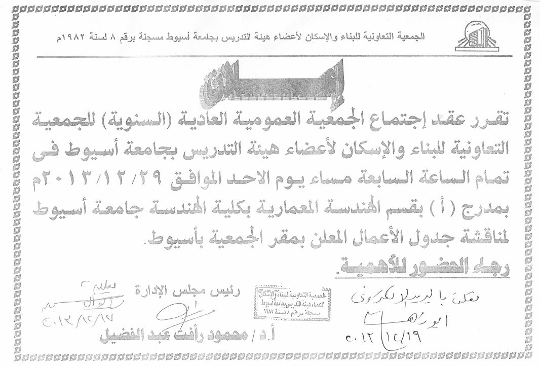 تقرر عقد الجمعية العمومية العادية للجمعية التعاونية للبناء والإسكان لأعضاء هيئة التدريس بجامعة أسيوط فى تمام الساعة السابعة مساء يوم الحد الموافق 29/12/2013 بمدرج أ بقسم الهندسة المعمارية بكلية الهدسة جامعة اسيوط لمناقشة جدول الأعمال المعلن بمقر الجمعية باسيوط.