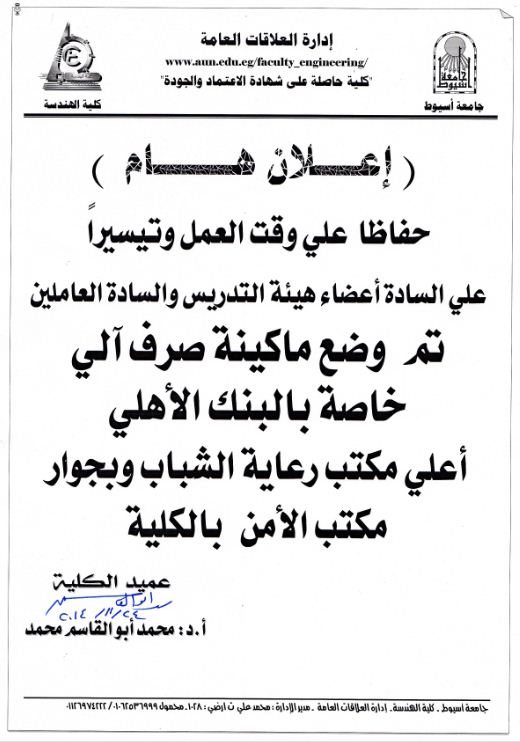 اعلان هام 24 نوفمبر 2014 حفاظاً على وقت العمل وتيسيراً على السادة أعضاء هيئة التدريس والسادة العاملين تم وضع ماكينة صرف آلى خاصة بالبنك الأهلى أعلى مكتب رعاية الشباب وبجوار مكتب الأمن بالكلية عميد الكلية أ.د/ محمد أبوالقاسم محمد