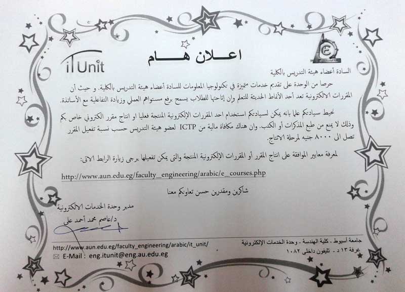نحيط سيادتكم علما بانه يمكن لسيادتكم استخدام احد المقررات الإلكترونية المنتجة فعليا او انتاج مقرر الكتروني خاص بكم وذلك لا يمنع من طبع المذكرات أو الكتب. وان هناك مكافاة مالية من ICTP لعضو هيئة التدريس حسب نسبة تفعيل المقرر تصل الى 8000 جنيه لمرحلة الانتاج.