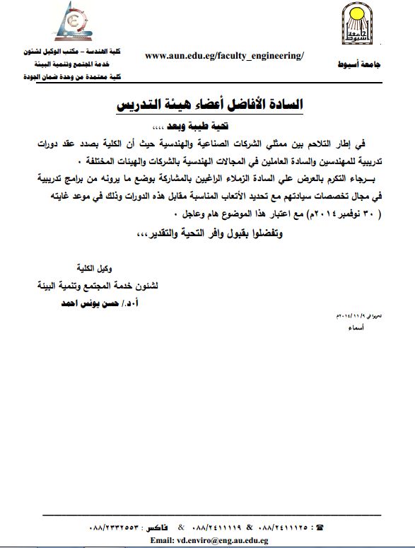 بـــــرجاء التكرم بالعرض علي السادة الزملاء الراغبين بالمشاركة بوضع ما يرونه من برامج تدريبية في مجال تخصصات سيادتهم مع تحديد الأتعاب المناسبة مقابل هذه الدورات وذلك في موعد غايته ( ٣٠ نوفمبر٢٠١٤ ) م مع اعتبار هذا الموضوع هام وعاجل