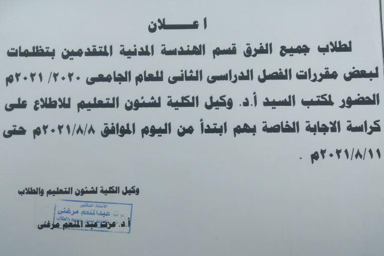 اعلان هام لطلاب قسم الهندسة المدنية المتقدمين بتظلمات