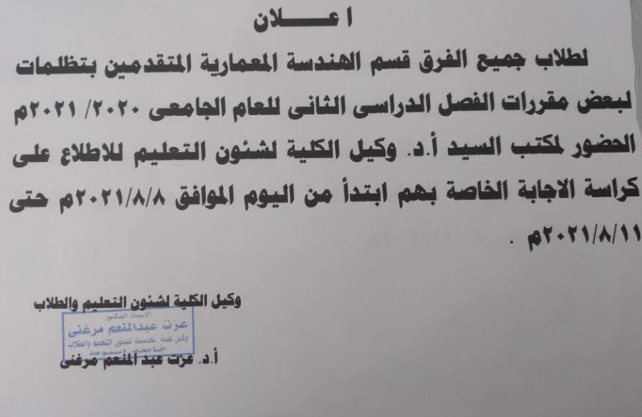 اعلان هام لطلاب قسم الهندسة المعمارية المتقدمين بتظلمات