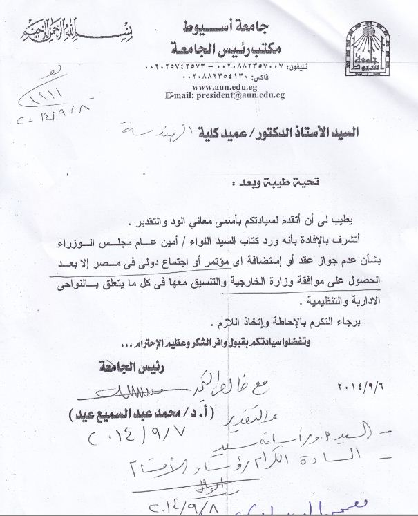 أتشرف بأنه ورد كتاب السيد اللواء / أمين عام مجلس الوزراء بشأن عدم جواز عقد أو إستضافة اى مؤتمر أو اجتماع دولى فى مصر الا بعد الحصول على موافقة وزارة الخارجية والتنسيق معها فى كل ما يتعلق بالنواحى الإدارية والتنظيمية .